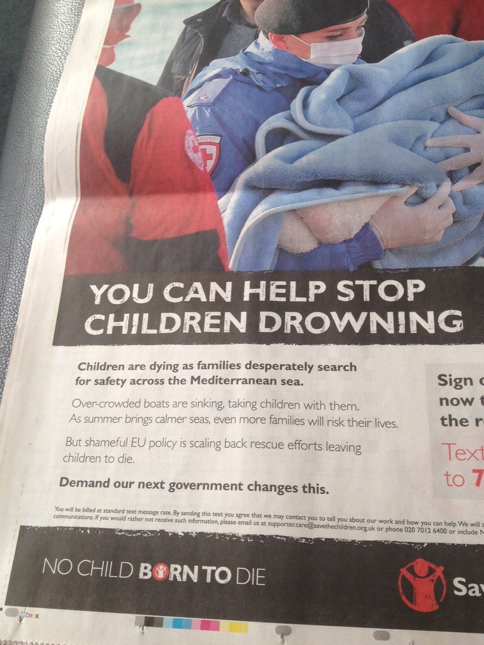 I am very pleased to see that Save the Children has launched a petition to restart rescue operations in the Mediterranean. I’ve just signed it, and encourage others to do so. I am grateful the organisation is working on this. I do however have a problem with the wording of the petition and the newspaper ad – and please, nothing personal against the lovely people that have been working hard on this campaign, as this is a broader issue that goes well beyond Save the Children.