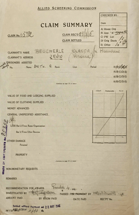 The memoir of Albert Watson Rhoades, one of the POWs who was hosted by the brave Bonato family, co-written by his grandson Stephen Hewson and including accounts by the daughters of Gilio Bonato, potentially confirms this interpretation. An account by Anna Bonato describes being woken up suddenly one night by noises on the street and having to rapidly warn the Englishmen to run out from the back door into the countryside as the Nazi-Fascist army was around, searching for them. Her sister Adelina Bonato also mentions a woman that was coming to bring clothes and supplies, a Mrs Cisorio, who must have part of the same network of women helpers that Iolanda was part of.