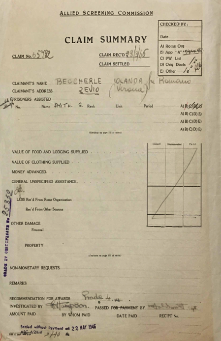 The memoir of Albert Watson Rhoades, one of the POWs who was hosted by the brave Bonato family, co-written by his grandson Stephen Hewson and including accounts by the daughters of Gilio Bonato, potentially confirms this interpretation. An account by Anna Bonato describes being woken up suddenly one night by noises on the street and having to rapidly warn the Englishmen to run out from the back door into the countryside as the Nazi-Fascist army was around, searching for them. Her sister Adelina Bonato also mentions a woman that was coming to bring clothes and supplies, a Mrs Cisorio, who must have part of the same network of women helpers that Iolanda was part of.